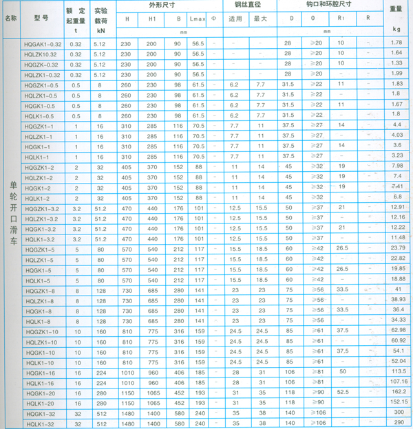 單輪開口滑車的技術參數: